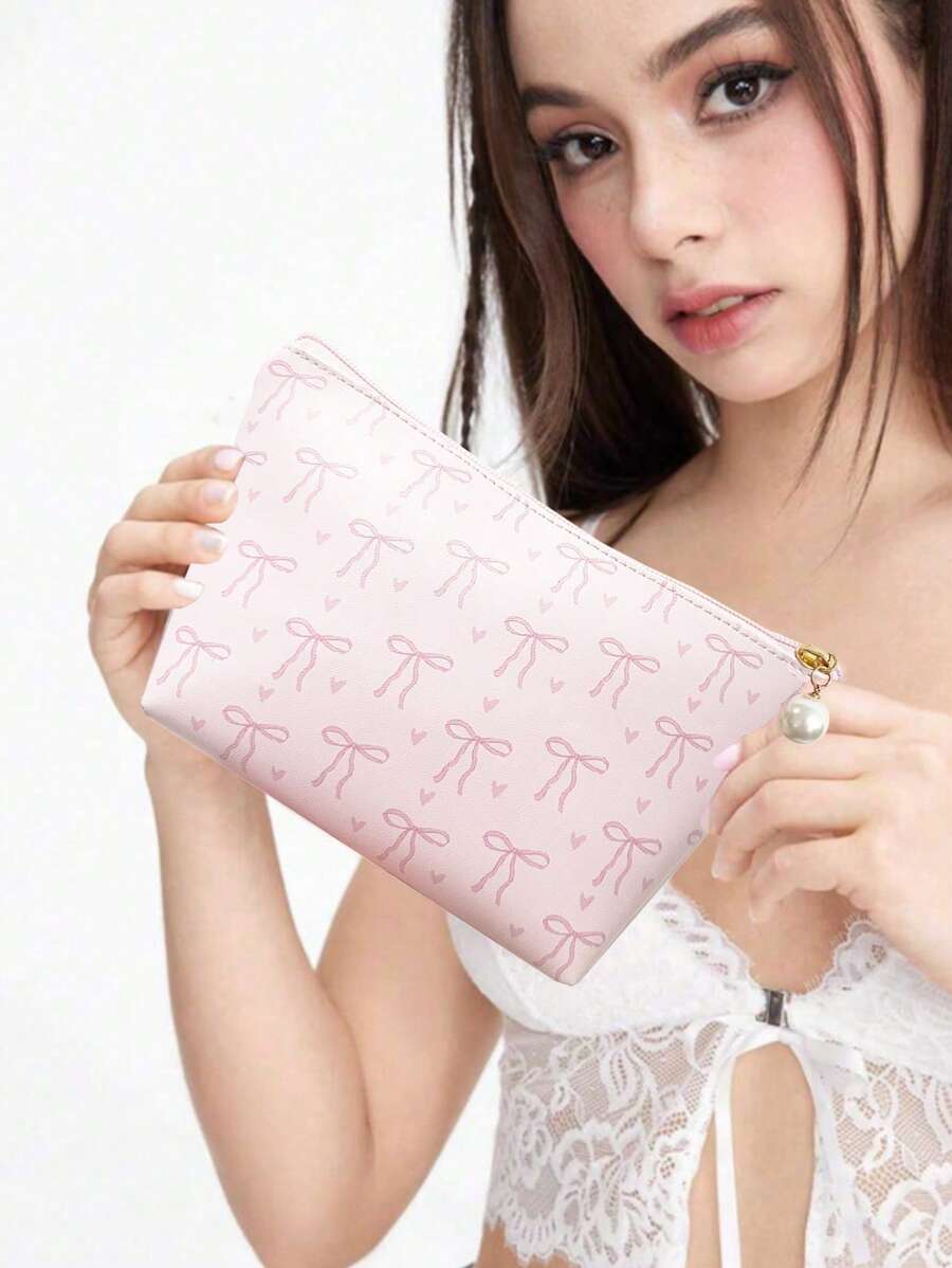 Kawaii Bolsa de cosméticos de gran capacidad con diseño de corazón y lazo para niñas, 919979