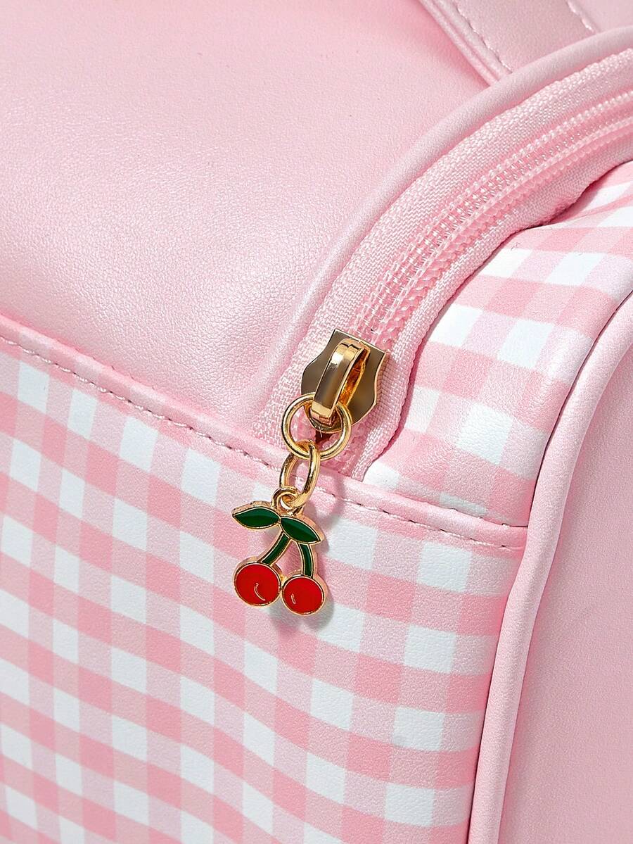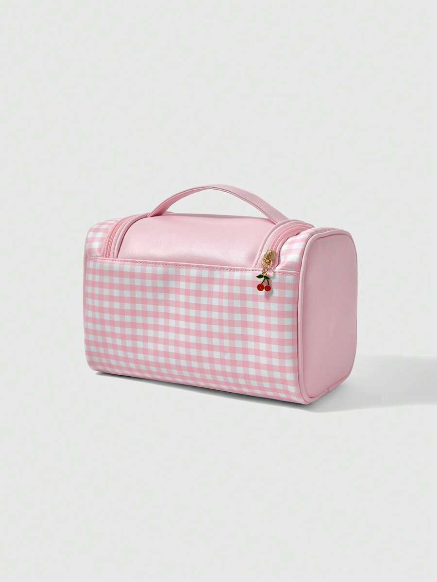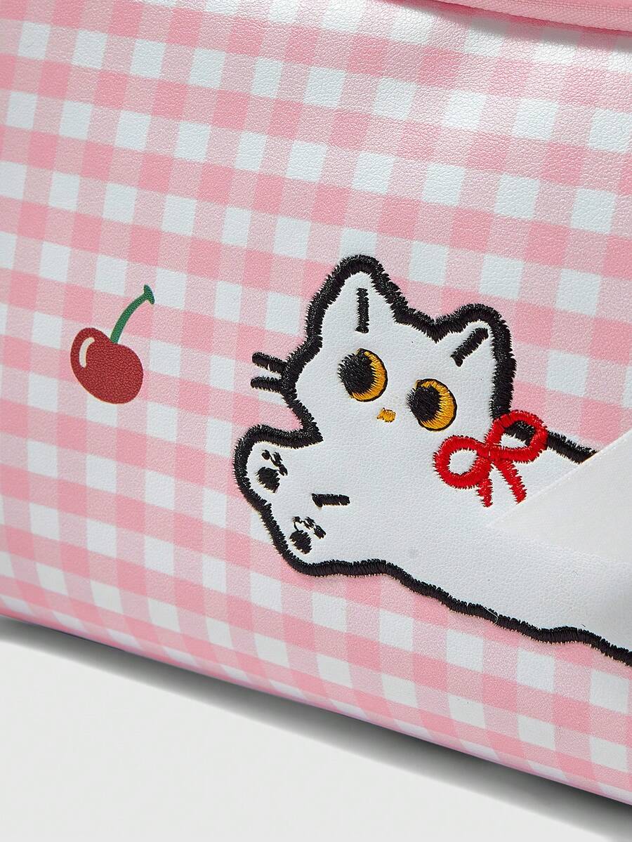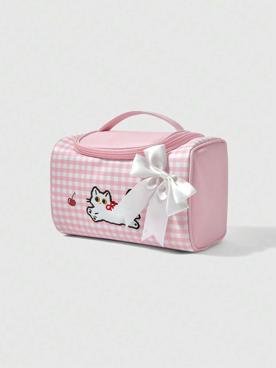 Kawaii Bolsa organizadora de cosméticos de gran capacidad con diseño de gato y cereza a cuadros rosas