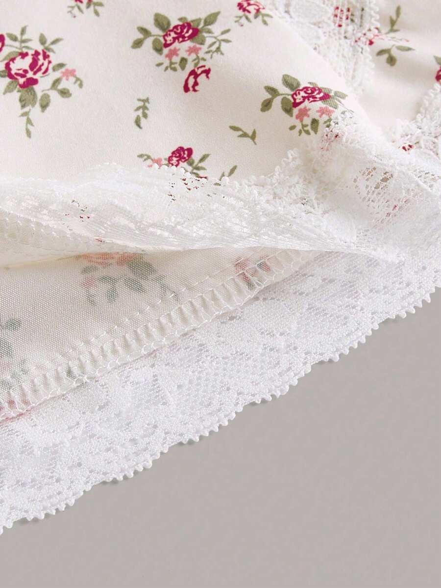 Kawaii Top camisero de estilo babydoll con estampado floral diminuto y encaje en contraste, para la escuela