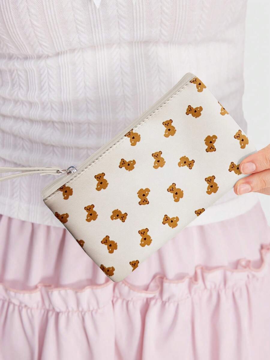 Kawaii Bolsa de cosméticos y monedero portátil grueso de gran capacidad con patrón completo de oso, moderno y sencillo 140097