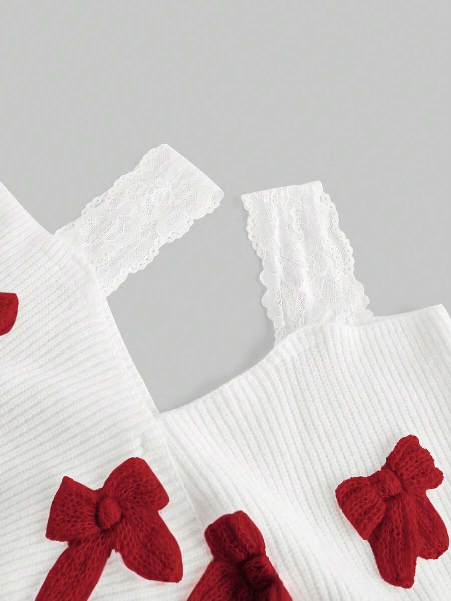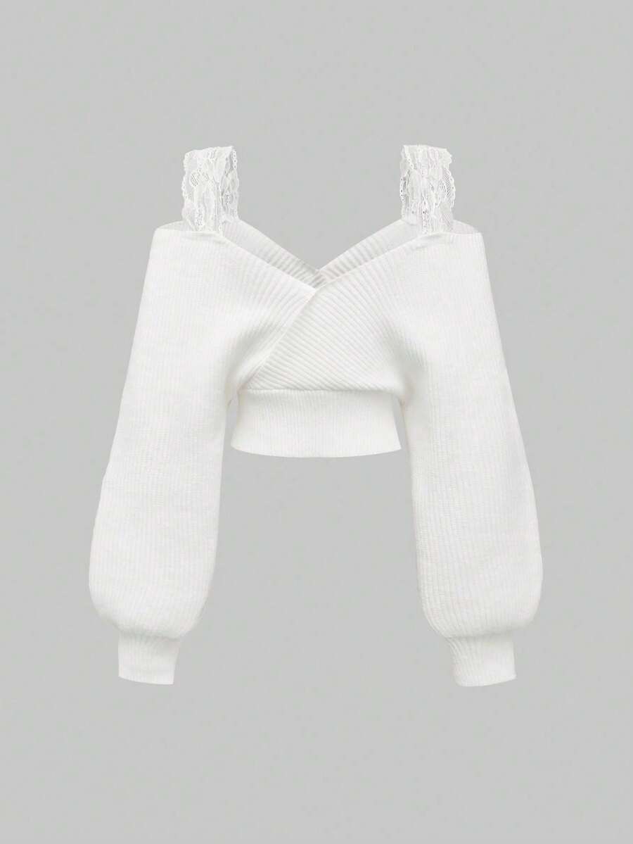 Kawaii Suéter holgado con cordones de encaje, escote en V profundo, hombros descubiertos y lazo, de estilo sexy francés