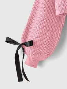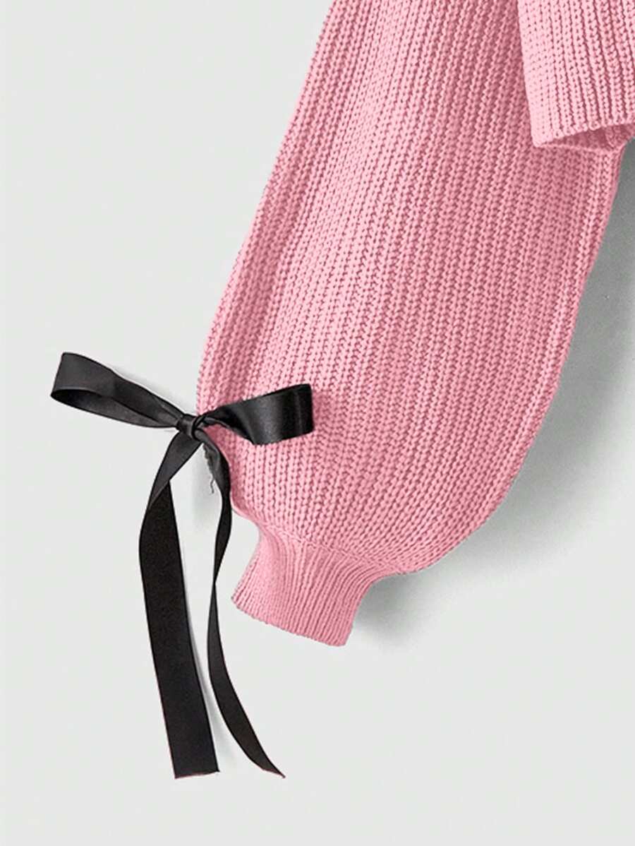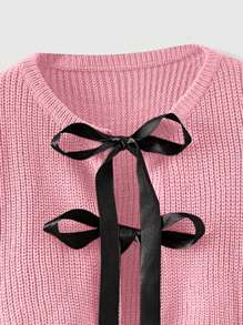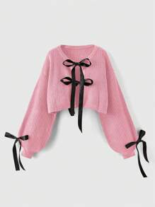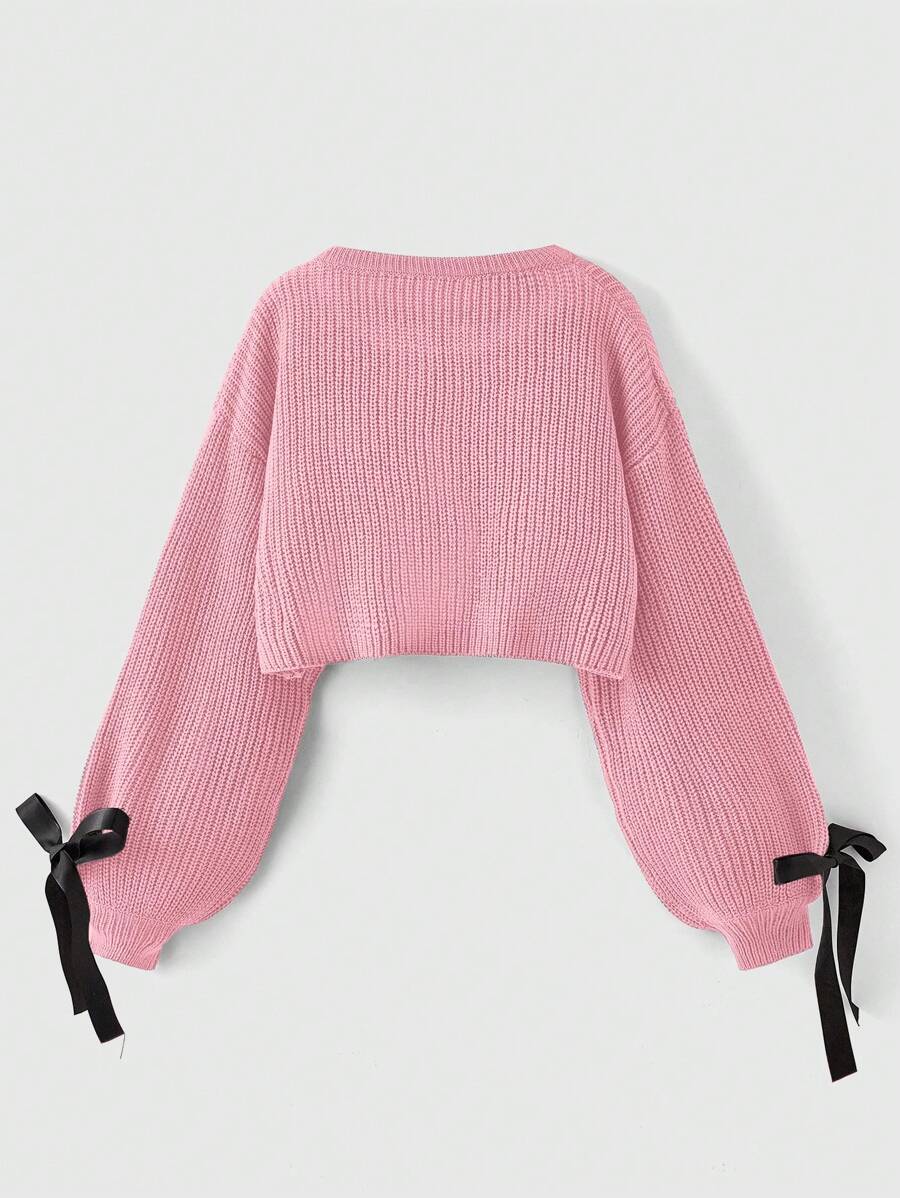 Kawaii Suéter tipo cárdigan con manga abullonada y decoración de lazo, de estilo femenino y adorable para mujeres