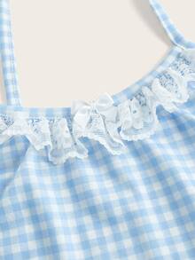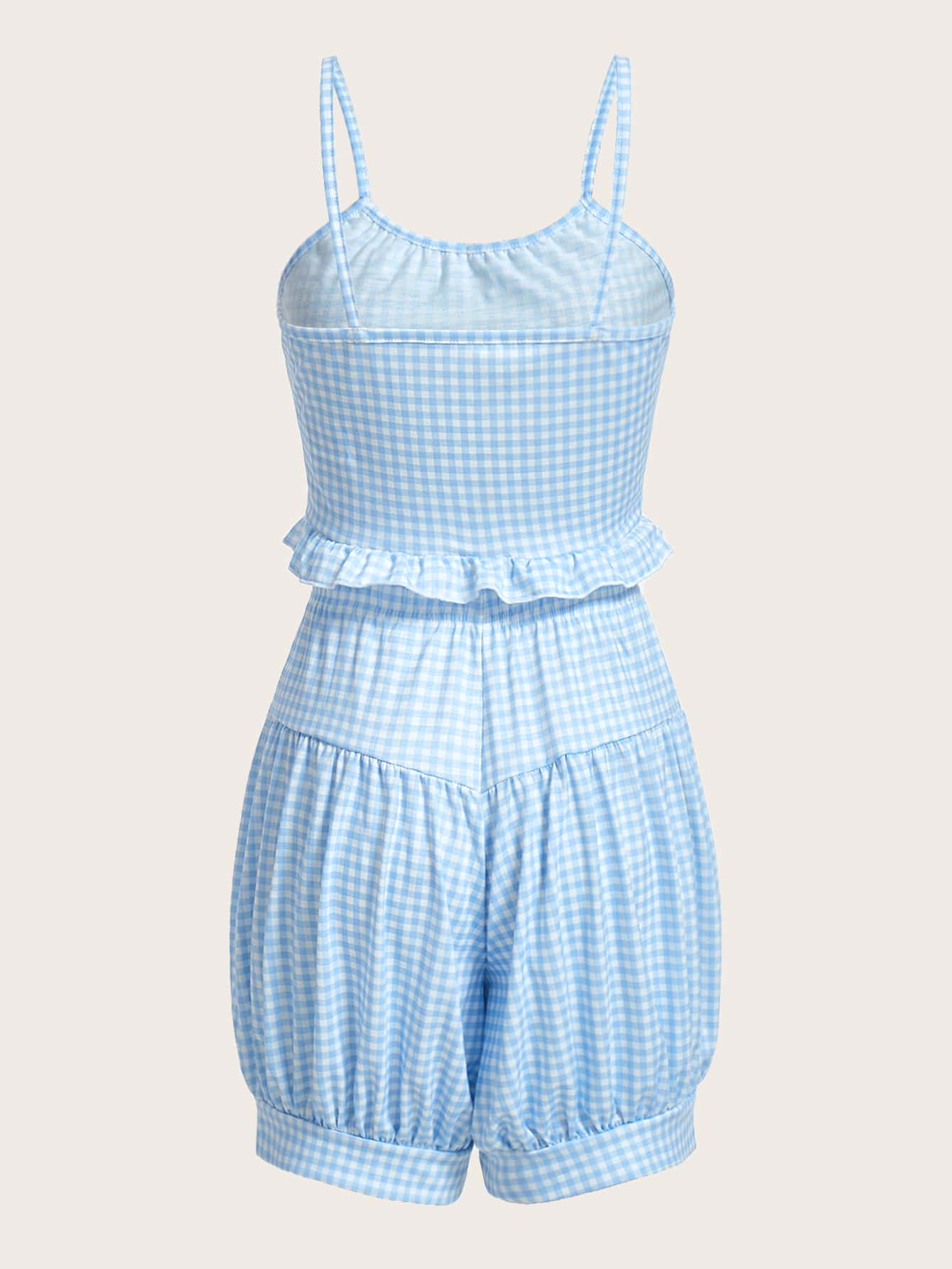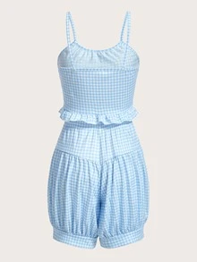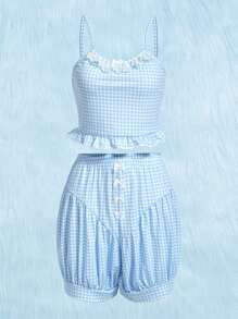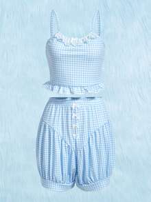 Kawaii Conjunto De Pijama Cuadrillé Con Borde De Volantes
