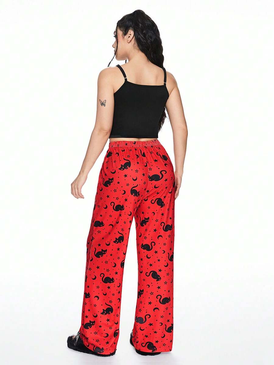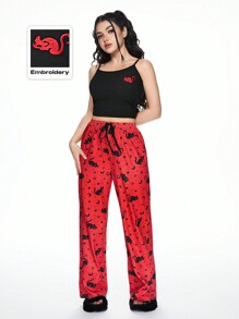 Kawaii Conjunto de ropa de dormir informal con bordado de gata gótica negra