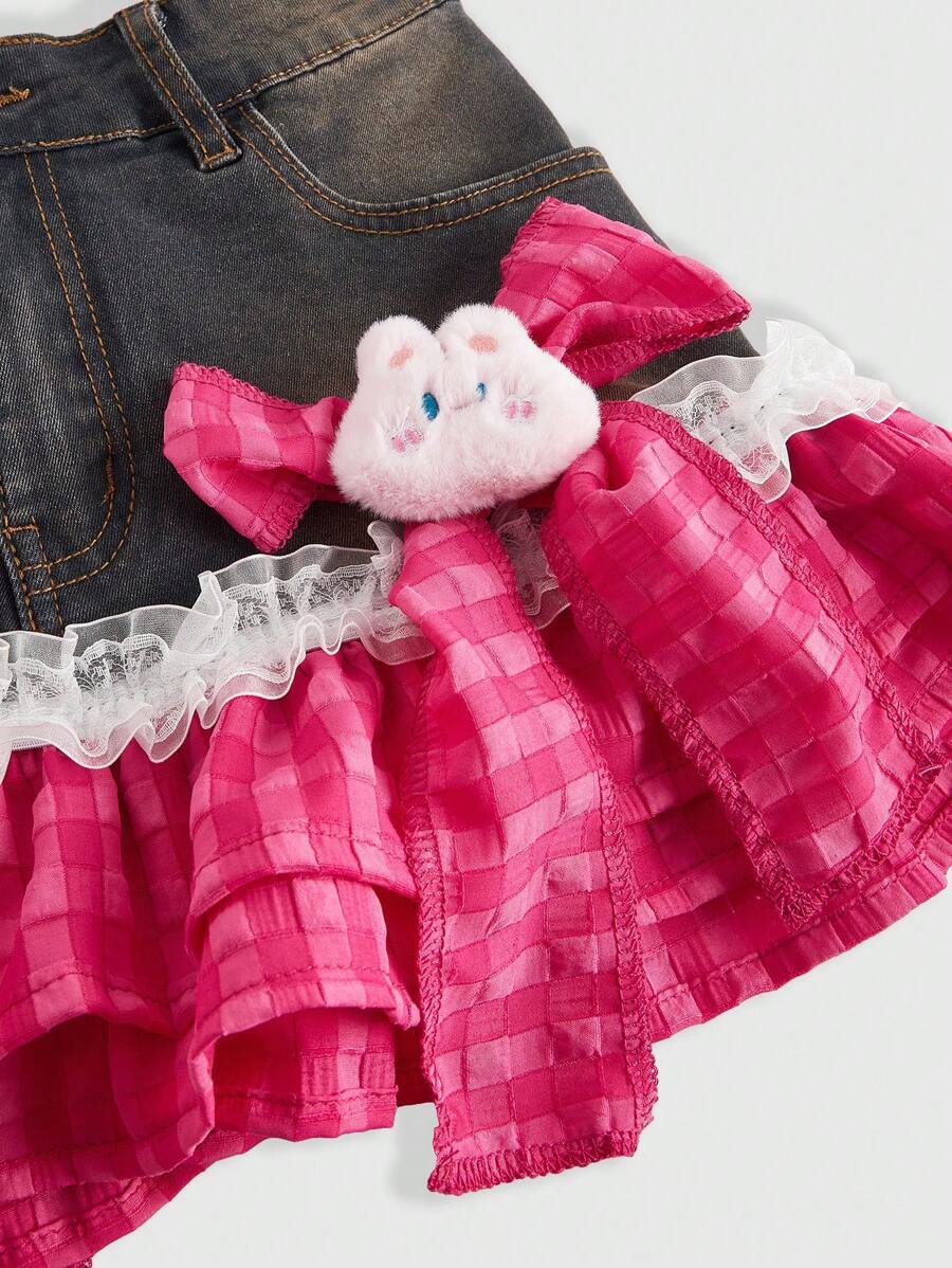 Kawaii Falda de mezclilla en línea A con parches y moños lindos para mujer estilo Gyaru