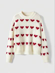 Kawaii Suéter de hombros caídos con patrón de corazón, blusas de manga larga