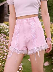 Kawaii Shorts en mezclilla con cordón con encaje en contraste