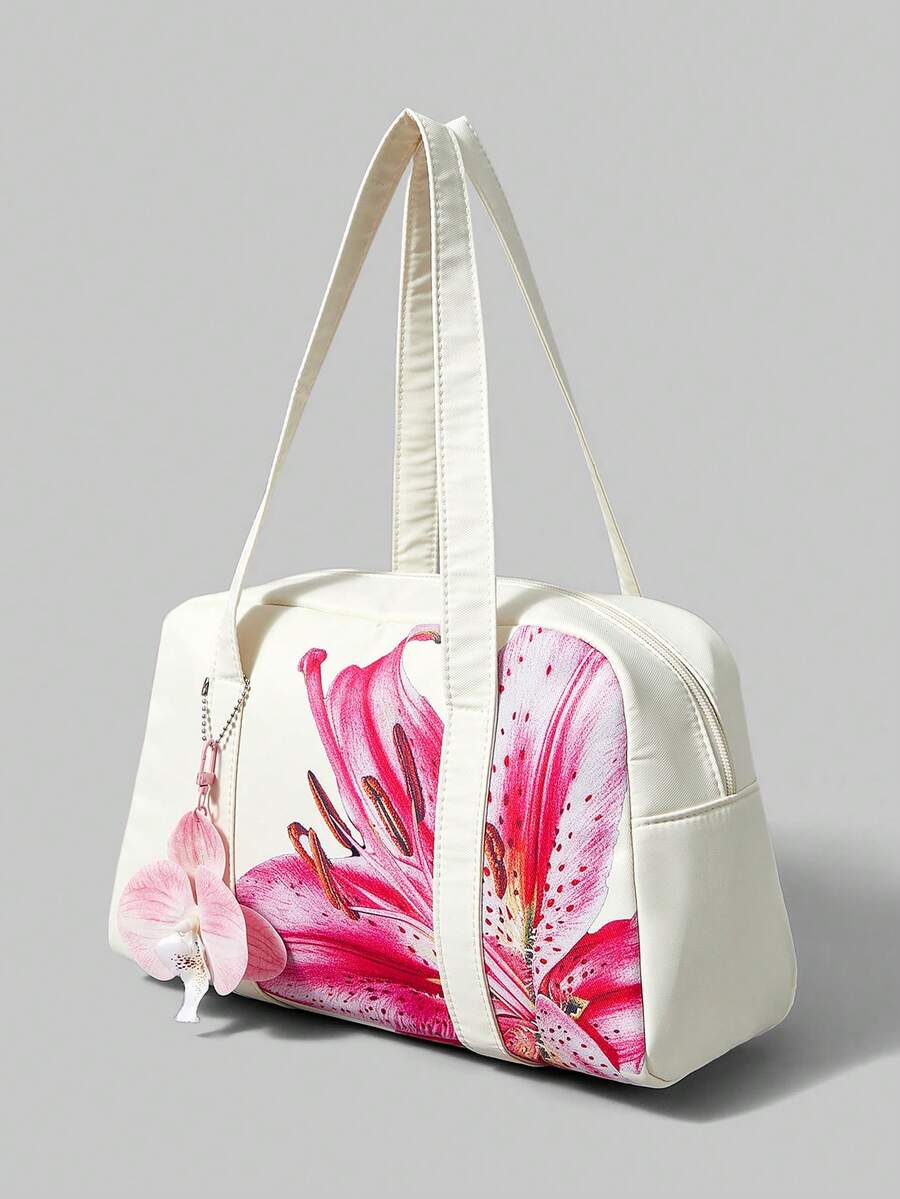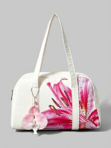 Kawaii Bolso de mano grande de estilo floral para uso casual, de viaje y commuting para mujeres, bolso de hombro de moda con estampado floral rosa, blanco