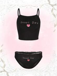Kawaii Set de lencería con letra con bordado de corazón ribete fruncido