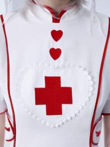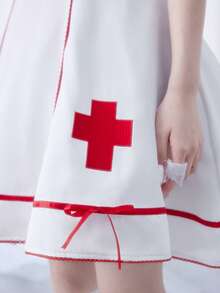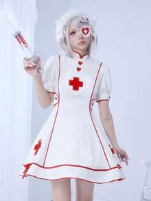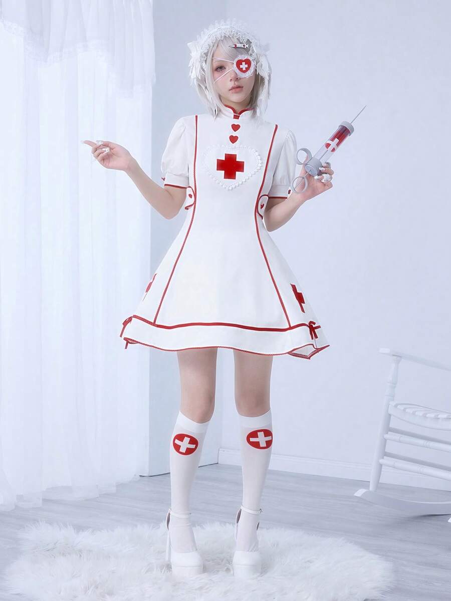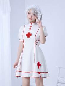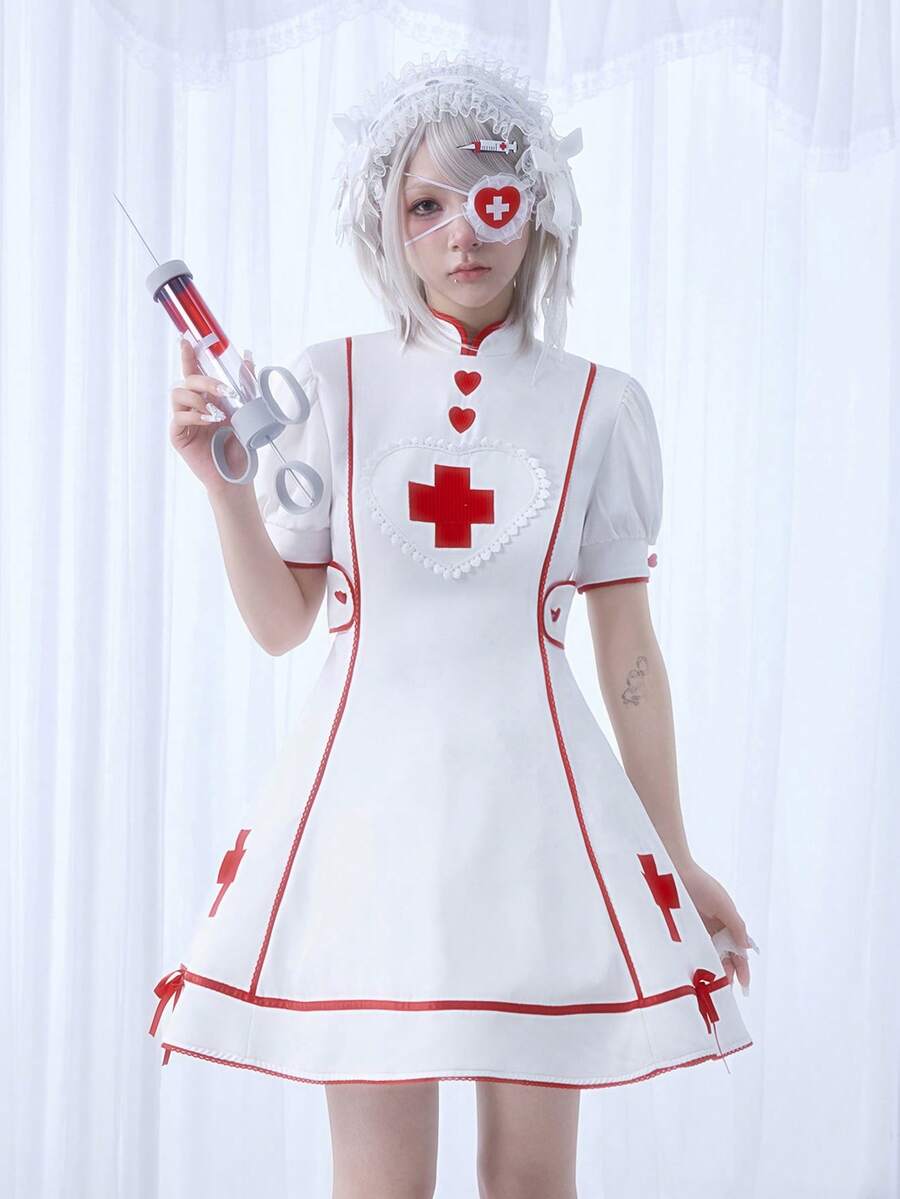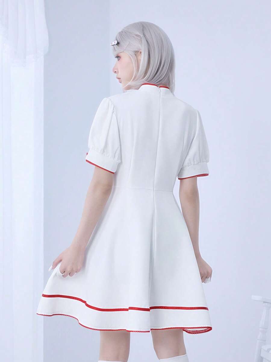Kawaii Vestido mini con mangas abullonadas, bordado cruzado, estilo dulce y lindo de enfermera Lolita para mujeres
