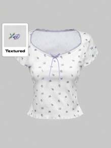 Kawaii Camiseta sexy con ajuste elástico, estilo casual Mori Girl, con estampado floral sencillo y lazo para mujeres