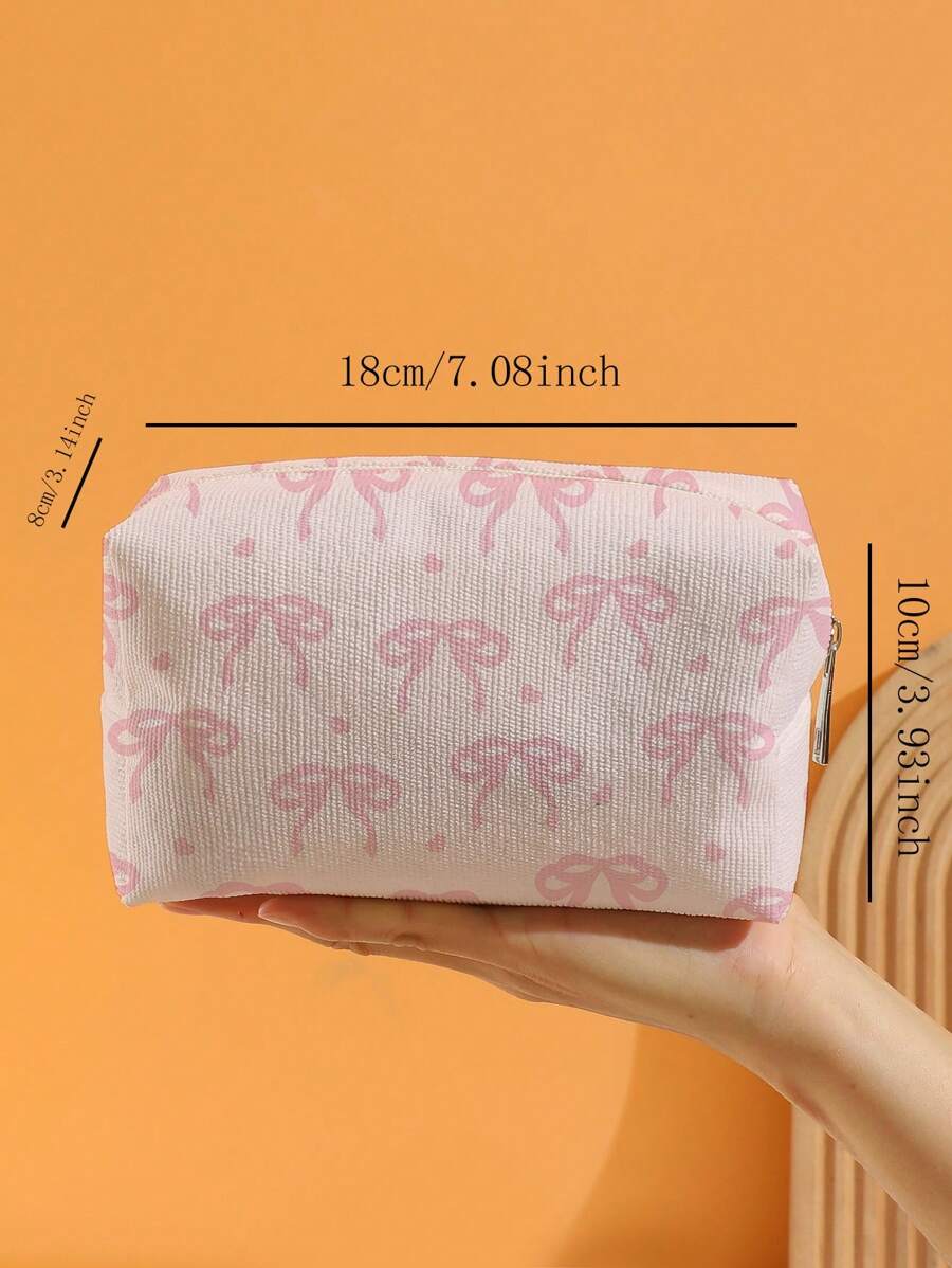 Kawaii Bolso de cosméticos de terciopelo octagonal rosa con impresión de corazón y lazo