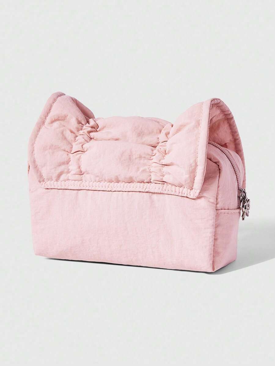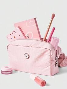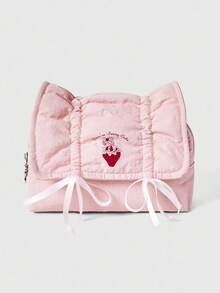 Kawaii Bolsa de cosméticos y estuche de lápices portátil de gran capacidad con cordón, lazo y diseño de fresa en color rosa