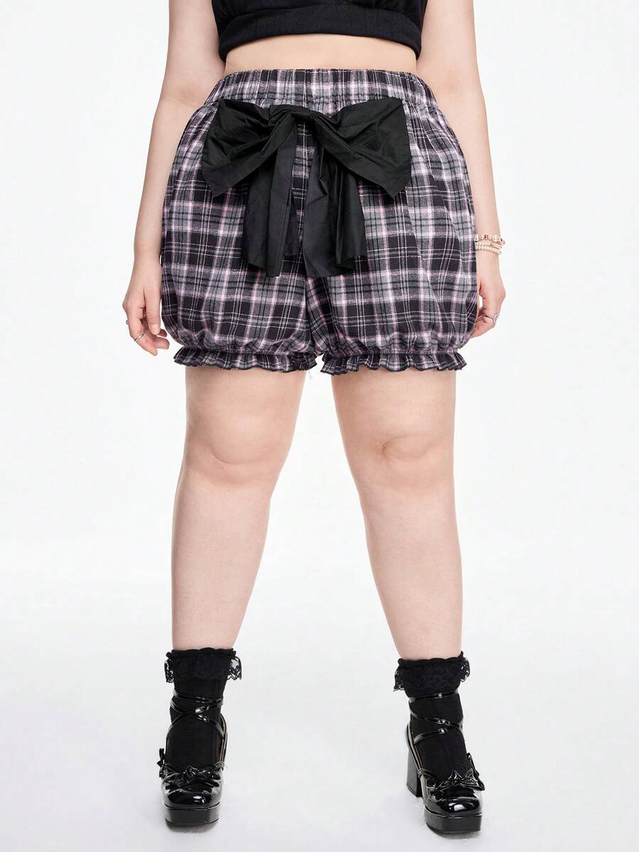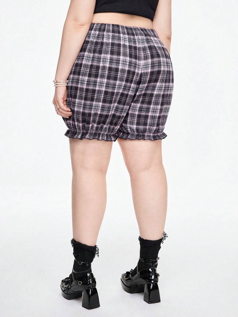 Kawaii Shorts con estampado a cuadros, detalle de lazo y ribete con volantes en tallas grandes