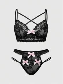 Kawaii Conjunto de sujetador con aros y pantalones de encaje romántico con lazo y cruce para talla grande, para el Día de San Valentín