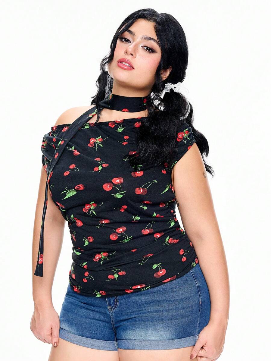 Kawaii Camiseta de verano con ajuste entallado, cuello asimétrico y volantes con estampado de cerezas para tallas grandes