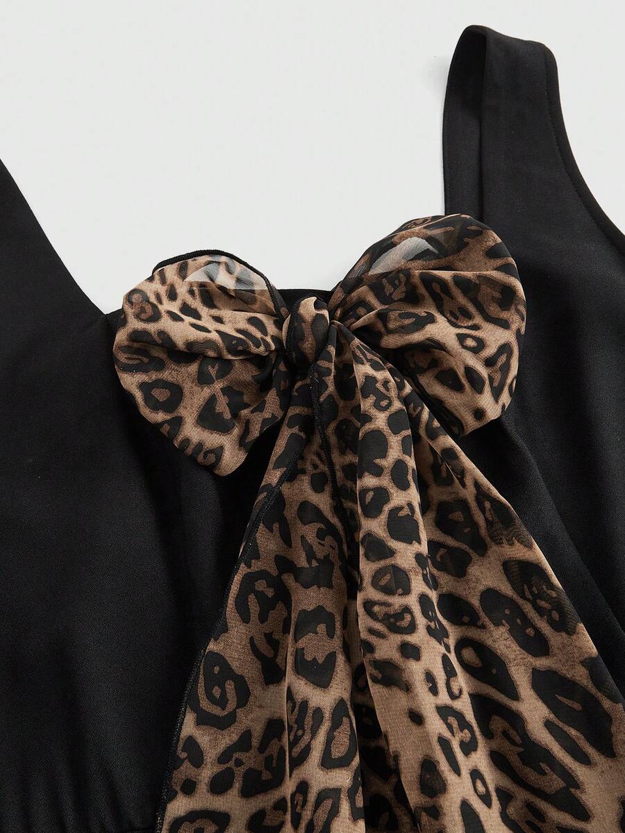 Kawaii Vestido de gasa transparente con estampado de leopardo, volantes y lazo en la talla grande