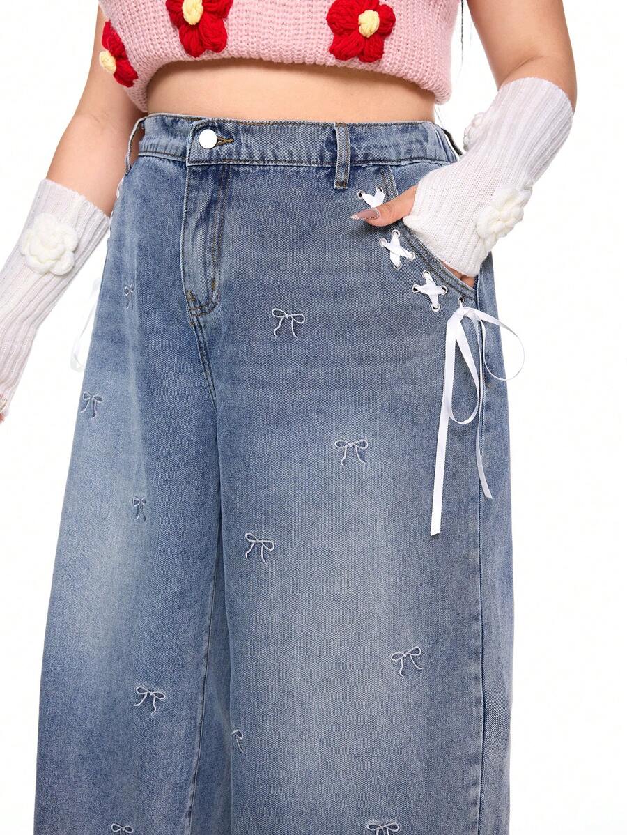 Kawaii Jeans de pierna recta y talle cruzado con lazo para mujer de talla grande
