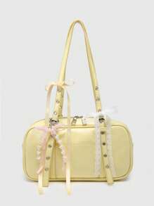 Kawaii Bolso de hombro de estilo retro para mujer con decoración de lazo a cuadros, adorno de corazón de cereza y múltiples bolsillos, tipo Boston