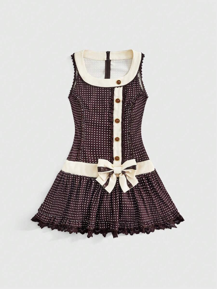 Kawaii Vestido mini sin mangas con lunares y lazo estilo retro dulce de Tiramusú