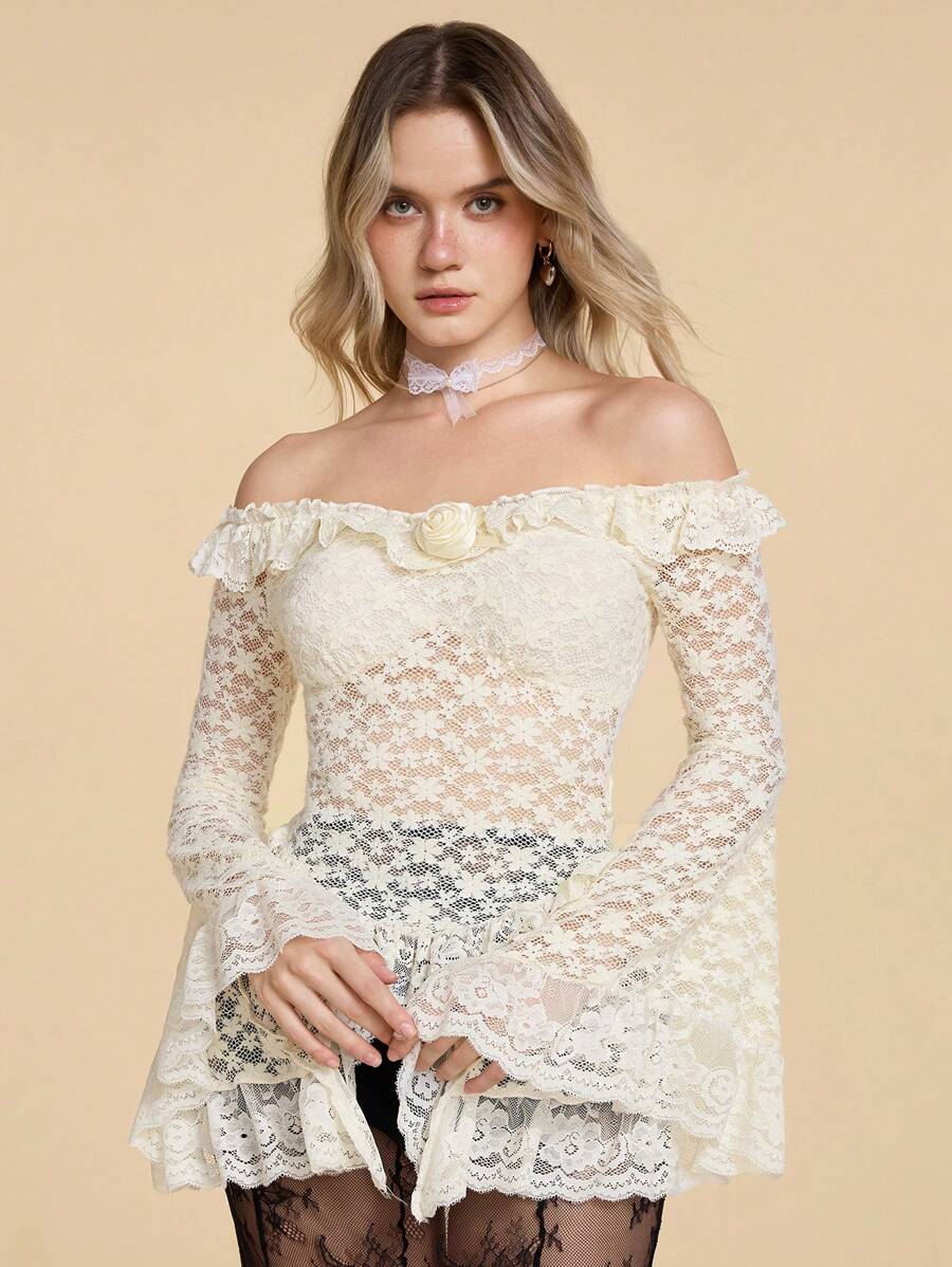 Kawaii Blusa romántica de encaje con manga abullonada y hombros descubiertos para mujeres