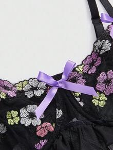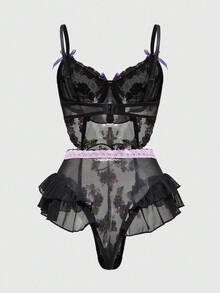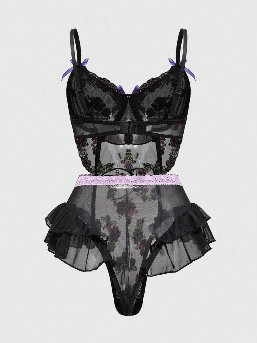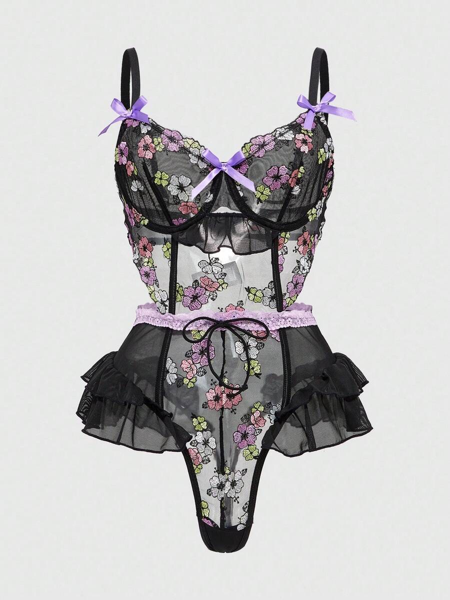 Kawaii Mono sexy hecho a mano con boning de acero, volantes y moño, con bordado delicado, en estilo romántico de campo para vacaciones, para mujeres