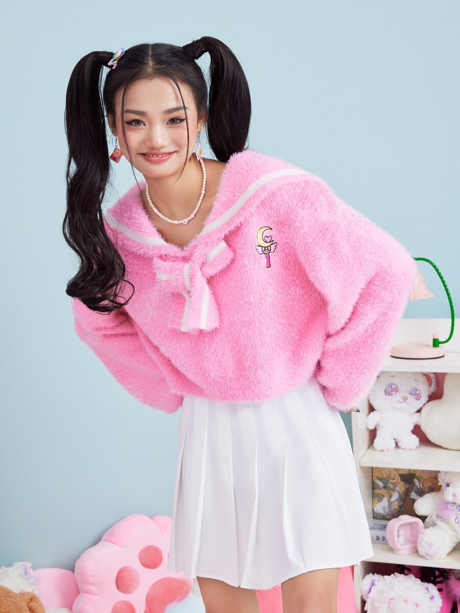 Kawaii Jersey cuello marinero con bordado de peluche