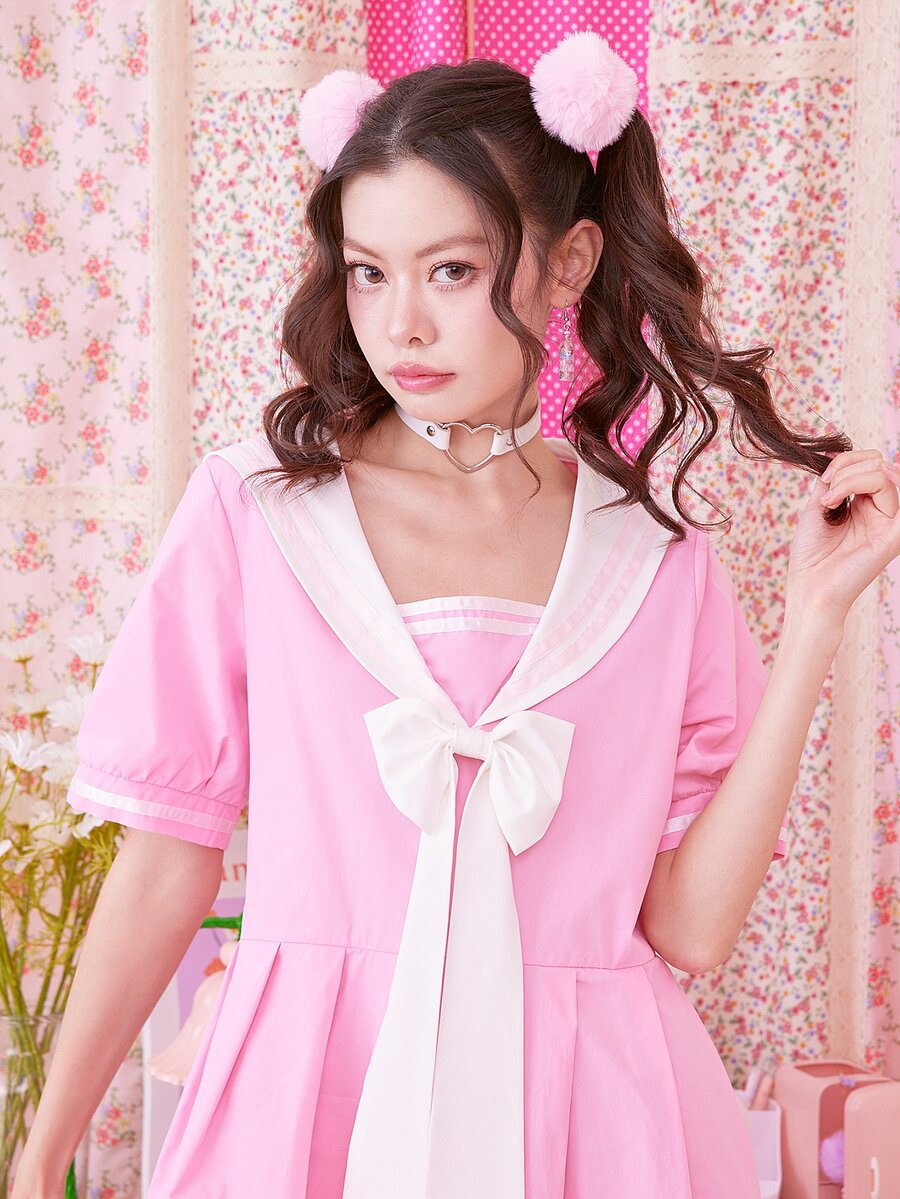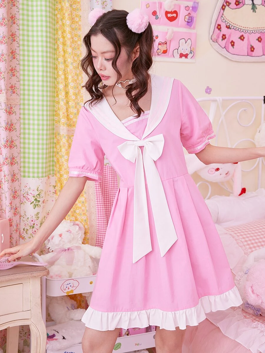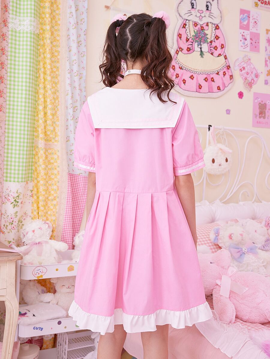 Kawaii Vestido cuello marinero con fruncido bajo con fruncido
