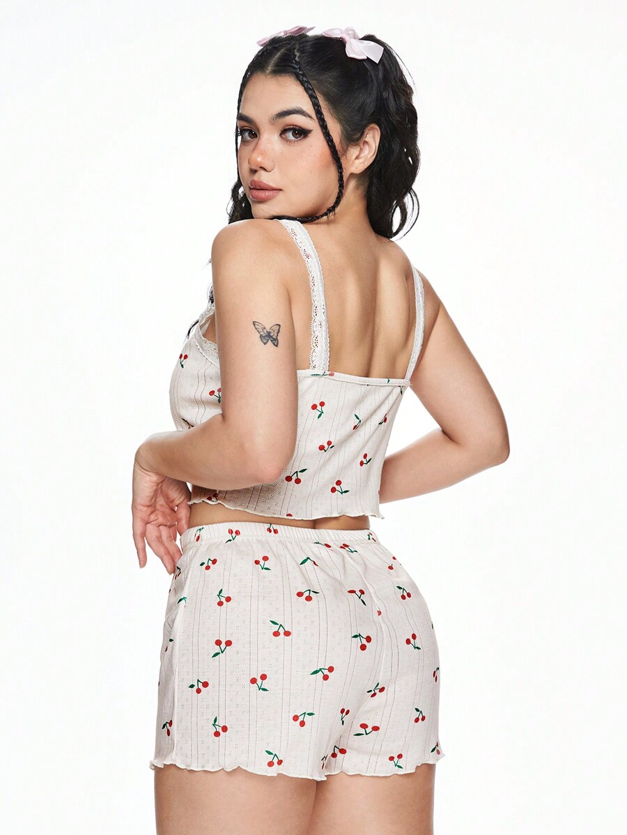 Kawaii Conjunto de pijama de camiseta de tirantes y pantalones cortos de punto con diseño de cerezas para mujer, suave y acogedor