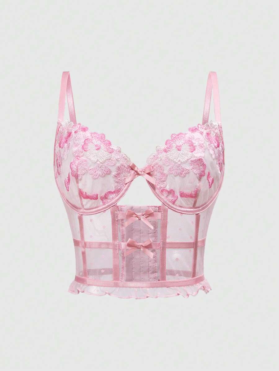 Kawaii Conjunto de sujetador con aros y braguitas bordado con flores primaverales y encaje elegante para mujeres