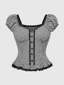 Kawaii Camisa casual a cuadros con volantes en el bajo y mangas abultadas para mujer, con cintura entallada, para primavera y verano
