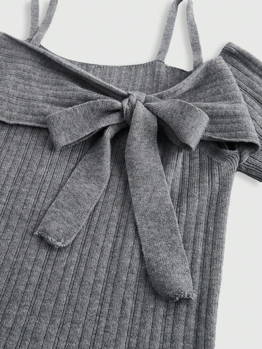 Kawaii Suéter gris para mujer con mangas largas elásticas, cuello de volantes con lazo, hombros descubiertos y cintura elástica, de estilo elegante y dulce de primavera
