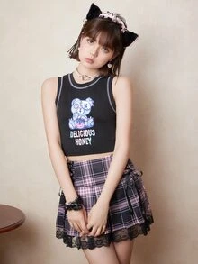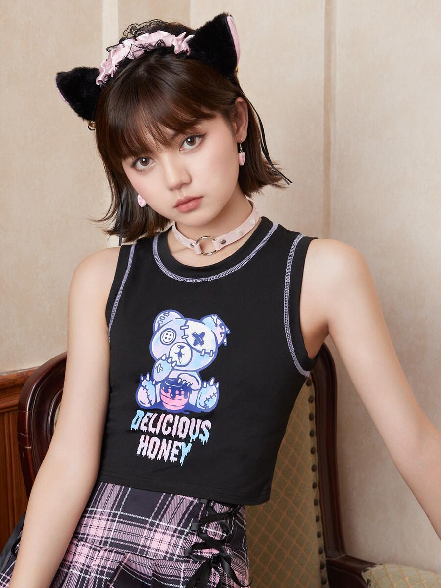 Kawaii Top tank ribete con puntada con letra con estampado de oso de dibujos animados