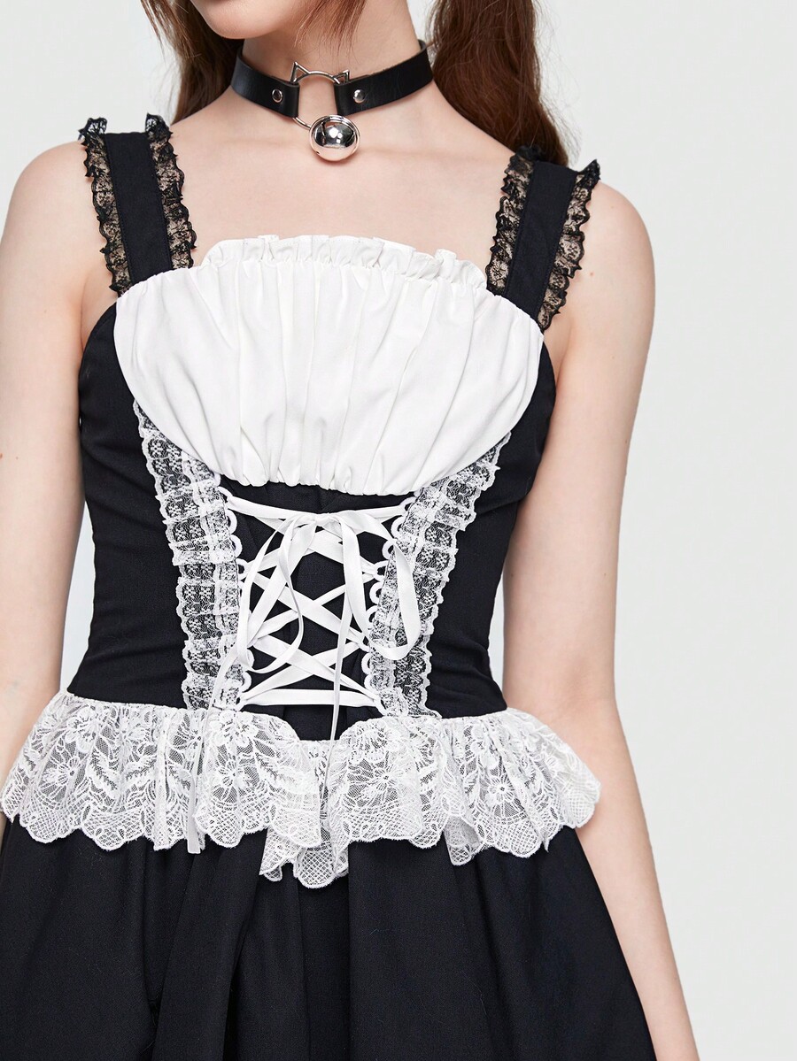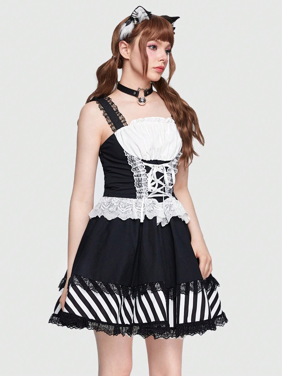 Kawaii Vestido de tirantes de rayas con cordón delantero con encaje en contraste