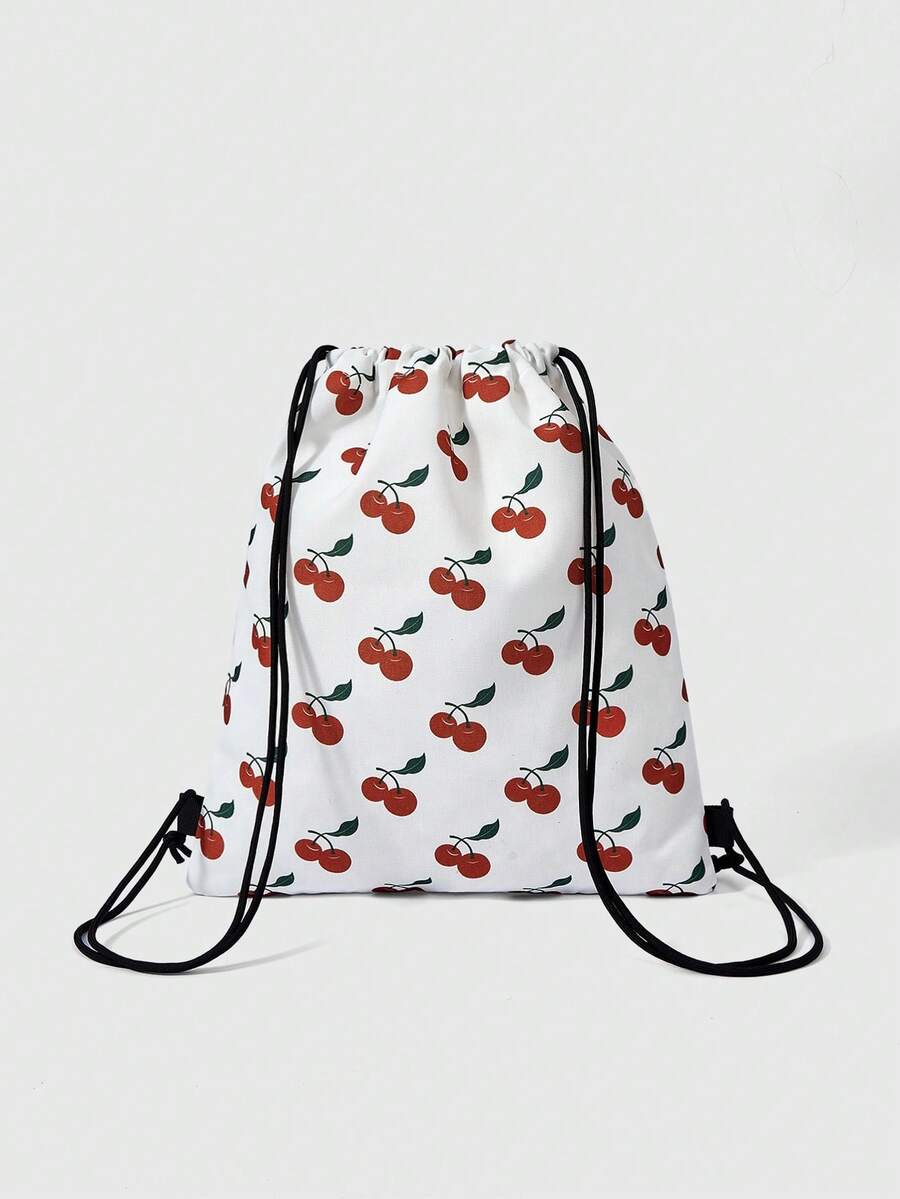 Kawaii Mochila con cordón estampada con cerezas dulces - Mochila casual ligera y encantadora con ribete de encaje y bolsillo transparente, bolsa de fitness para la escuela, ir y venir del trabajo, viajes y uso diario