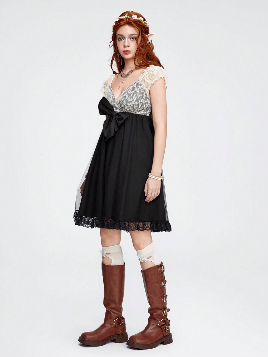 Kawaii Vestido de mini camisón de mujer en color blanco y negro con aplicaciones de encaje, ideal para una noche romántica