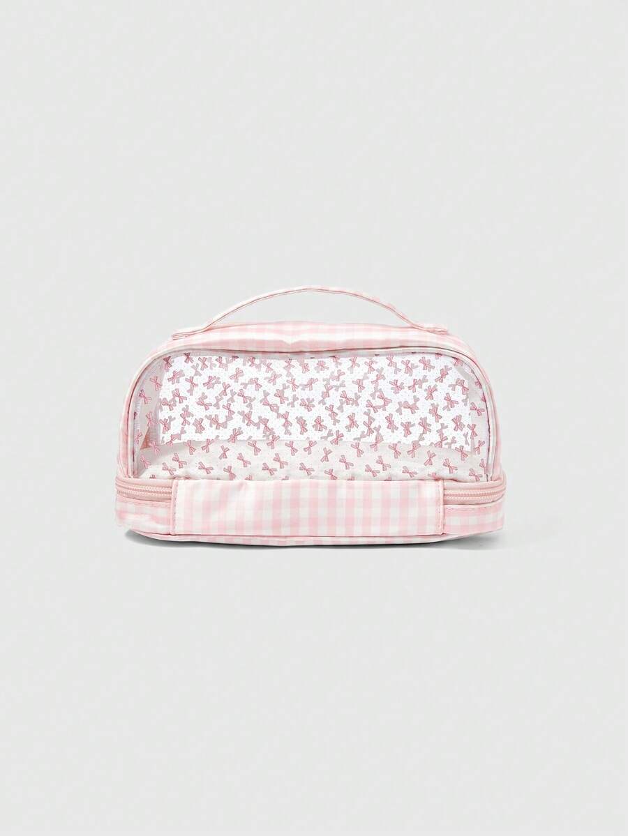Kawaii Bolsa de cosméticos portátil de gran capacidad con cremallera de doble capa transparente, decorada con moño rosa