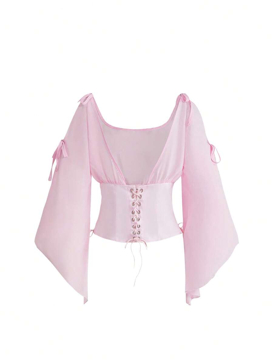 Kawaii Blusa de mujer con parches de gasa y satén, manga asimétrica, cinturón, elegante y casual para vacaciones