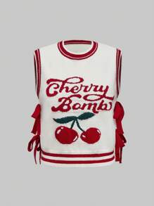 Kawaii Chaleco de punto con bordado de cerezas y lazo para mujeres para el Día de San Valentín