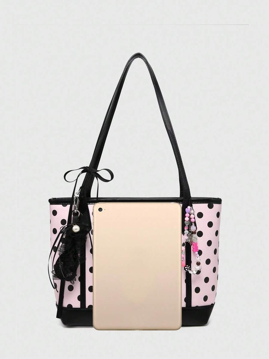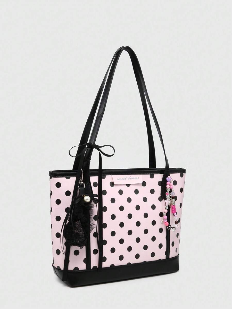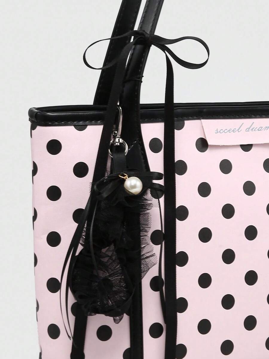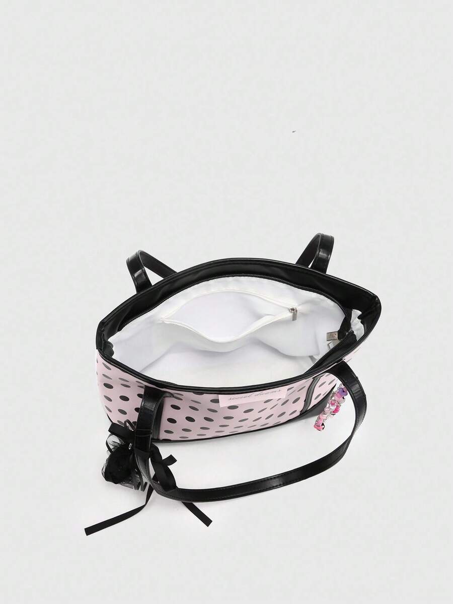 Kawaii Bolso de mano grande con capacidad de carga, con tirantes de lunares y lazo, estilo vintage, adecuado para compras y escuela