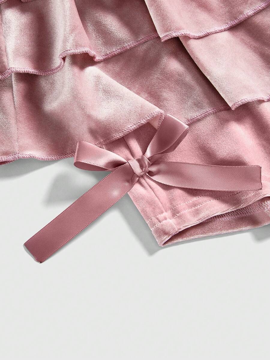 Kawaii Short de mujer talla grande con volantes en el bajo, lazo delantero y terciopelo rosa vintage