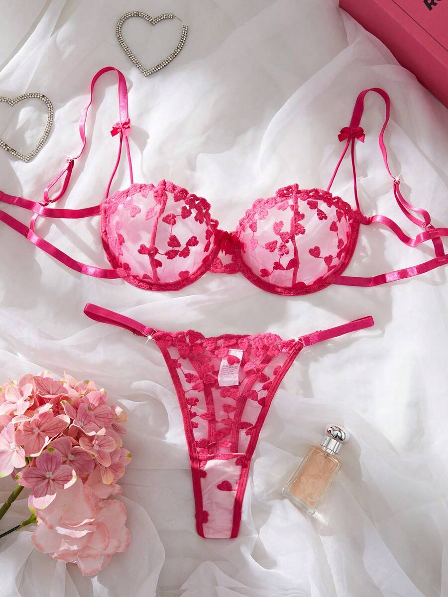Kawaii Conjunto de lencería sexy de 2 piezas con bordado de moño, apto para uso diario, Día de San Valentín, citas, rave
