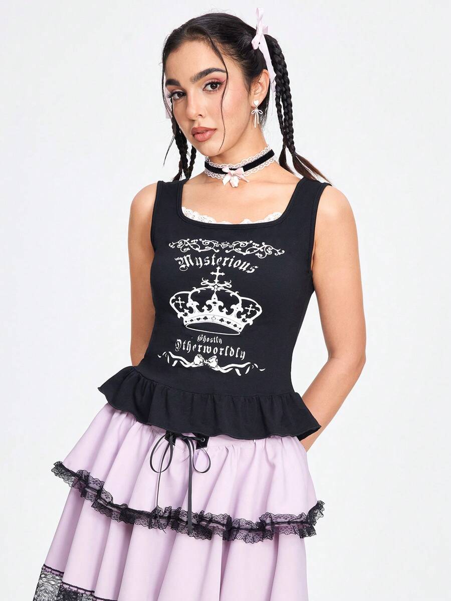 Kawaii Camiseta sin mangas de verano para mujer con impresión de corona y letras, cordón y lazo para atar en la espalda