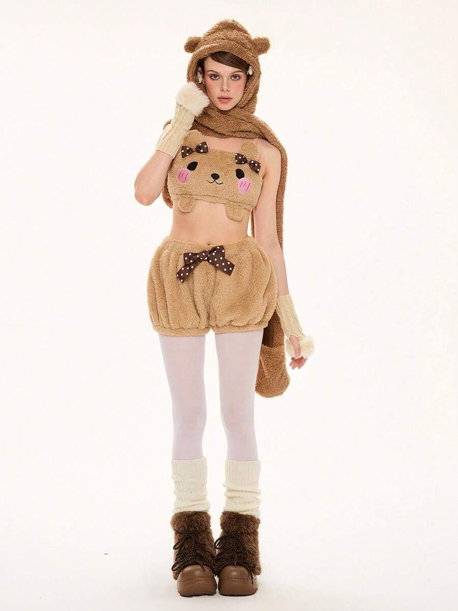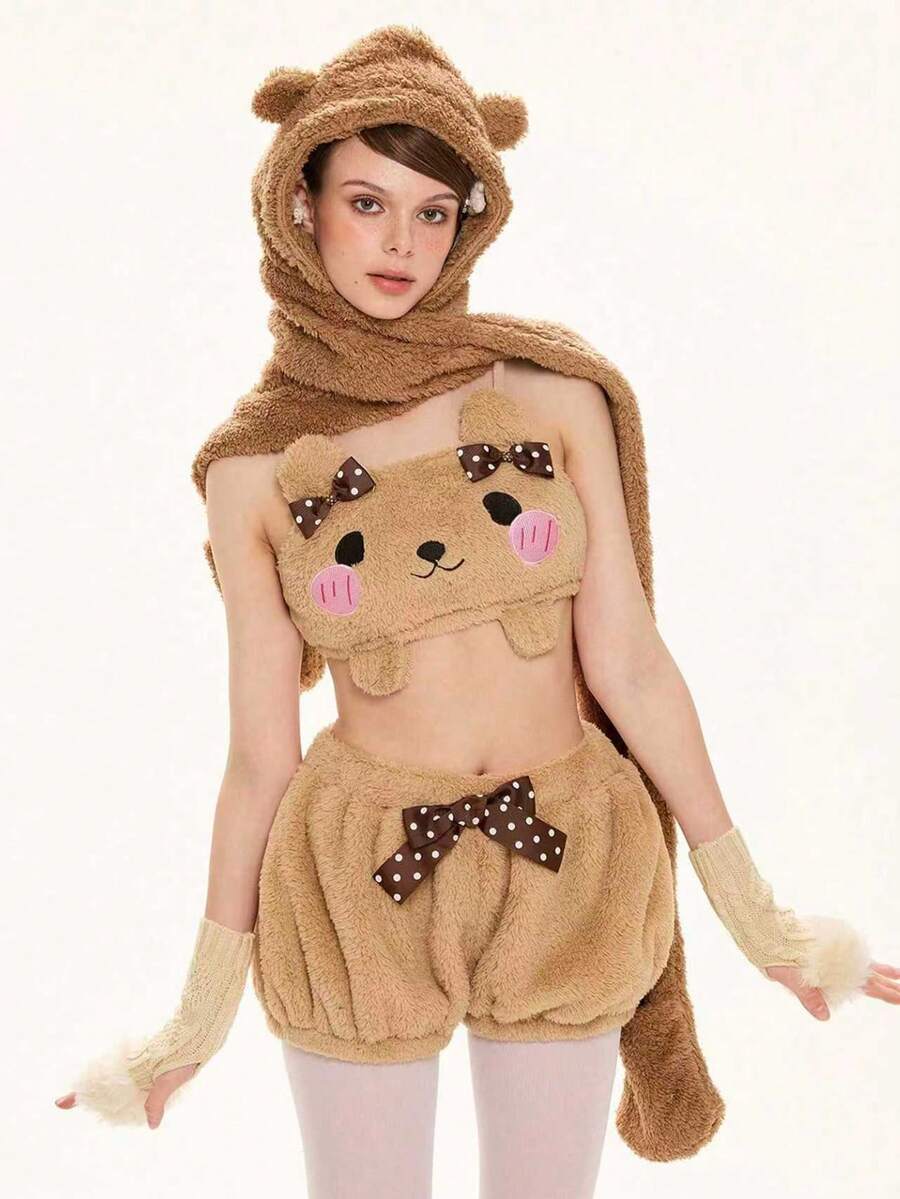 Kawaii Conjunto de 2 piezas de camiseta corta y pantalones cortos con decoración de orejas bordada en 3D de estilo lindo y de dibujos animados para mujer
