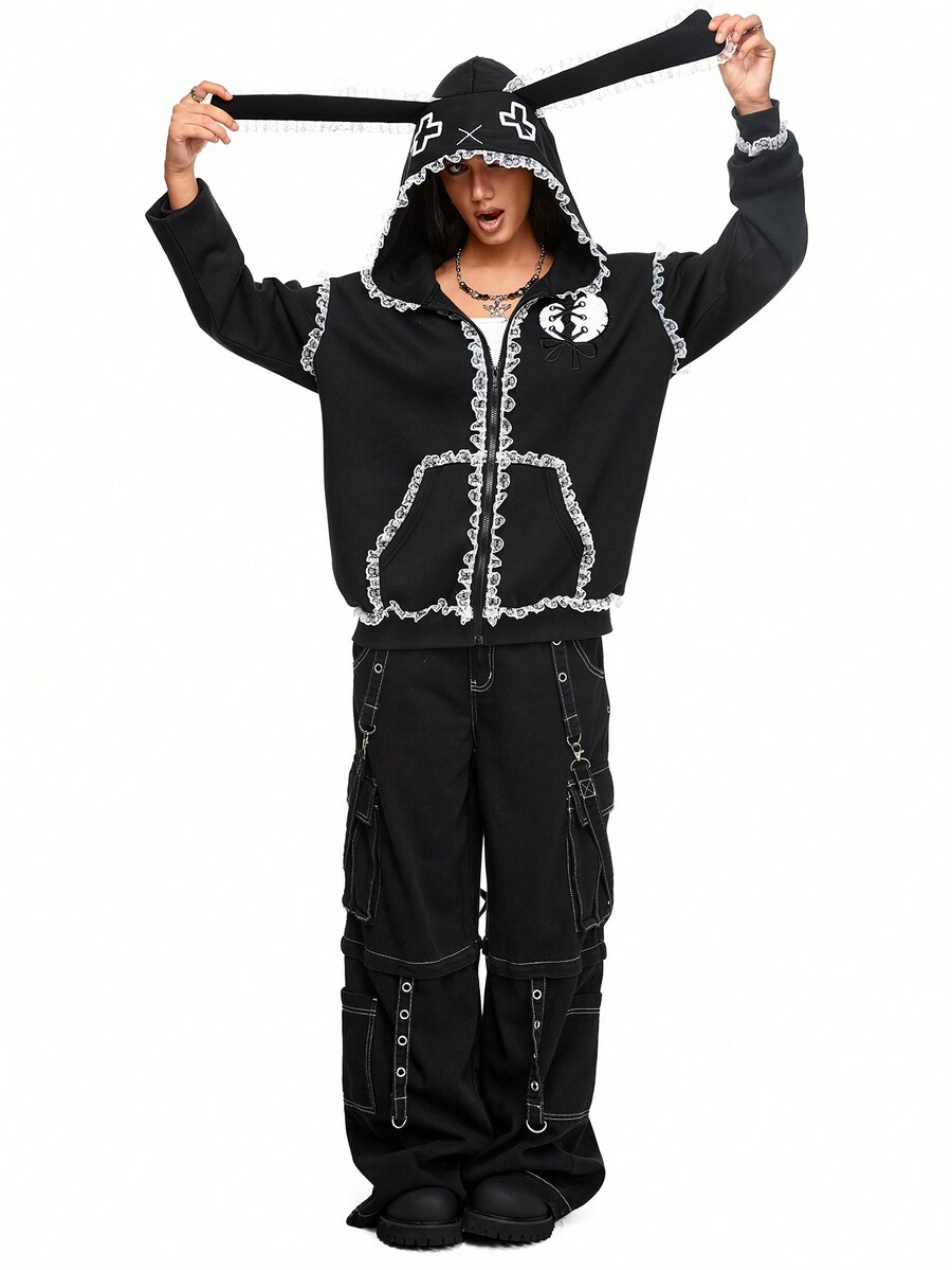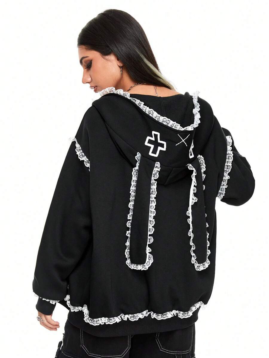 Kawaii Sudadera con capucha de forro polar con orejas de conejo oscuras, encaje en contraste y bordado de corazón para mujer