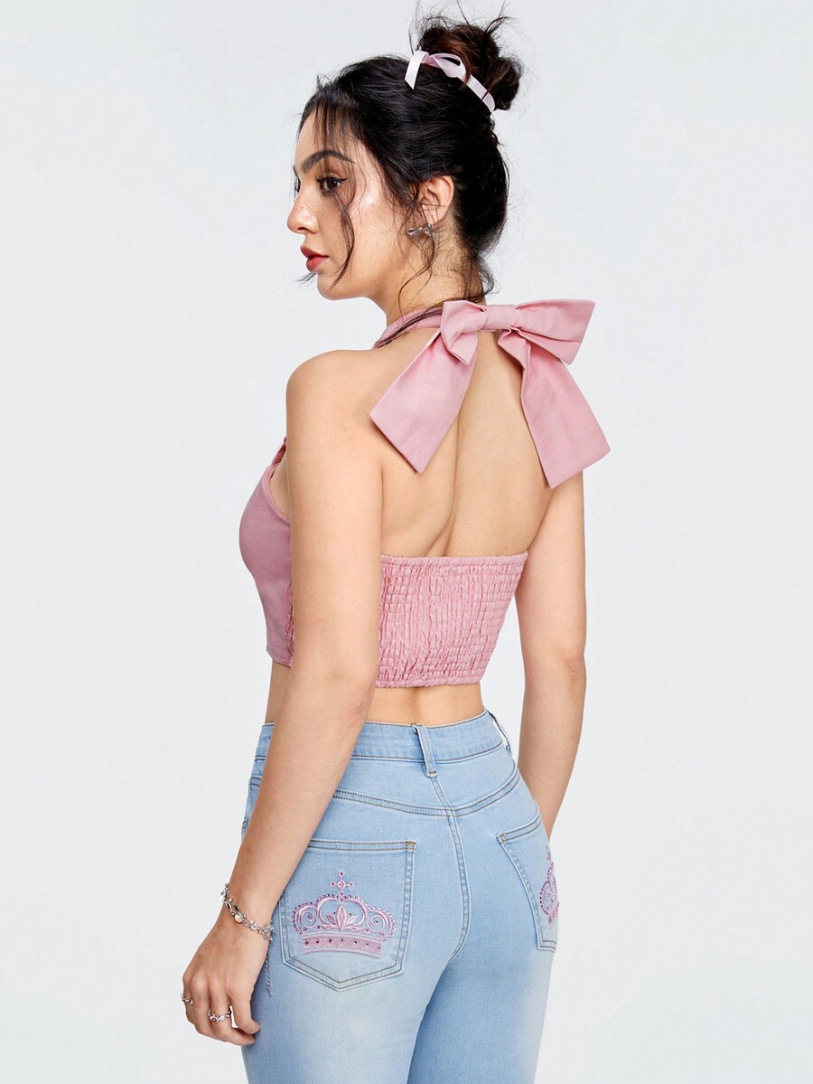 Kawaii Top corto de cuello halter para mujeres con parche de corazón, ideal para la temporada de graduación