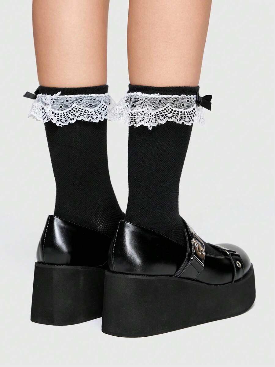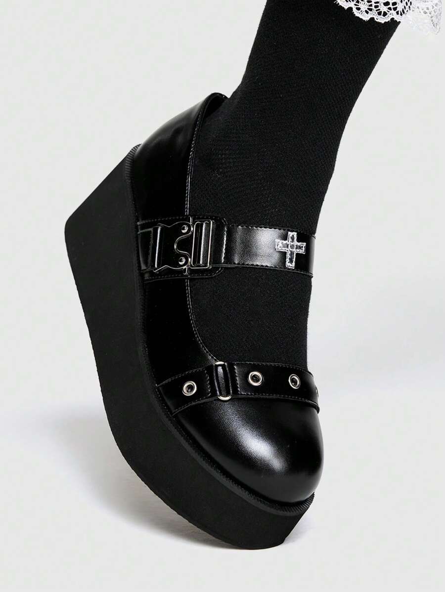 Kawaii Zapatos de mujer con plataforma y tacón en bloque, puntera redonda - Mocasines de estilo punk con suela gruesa negra, hebilla de cinturón, decoración de cadena de hierro y remaches, tacones altos