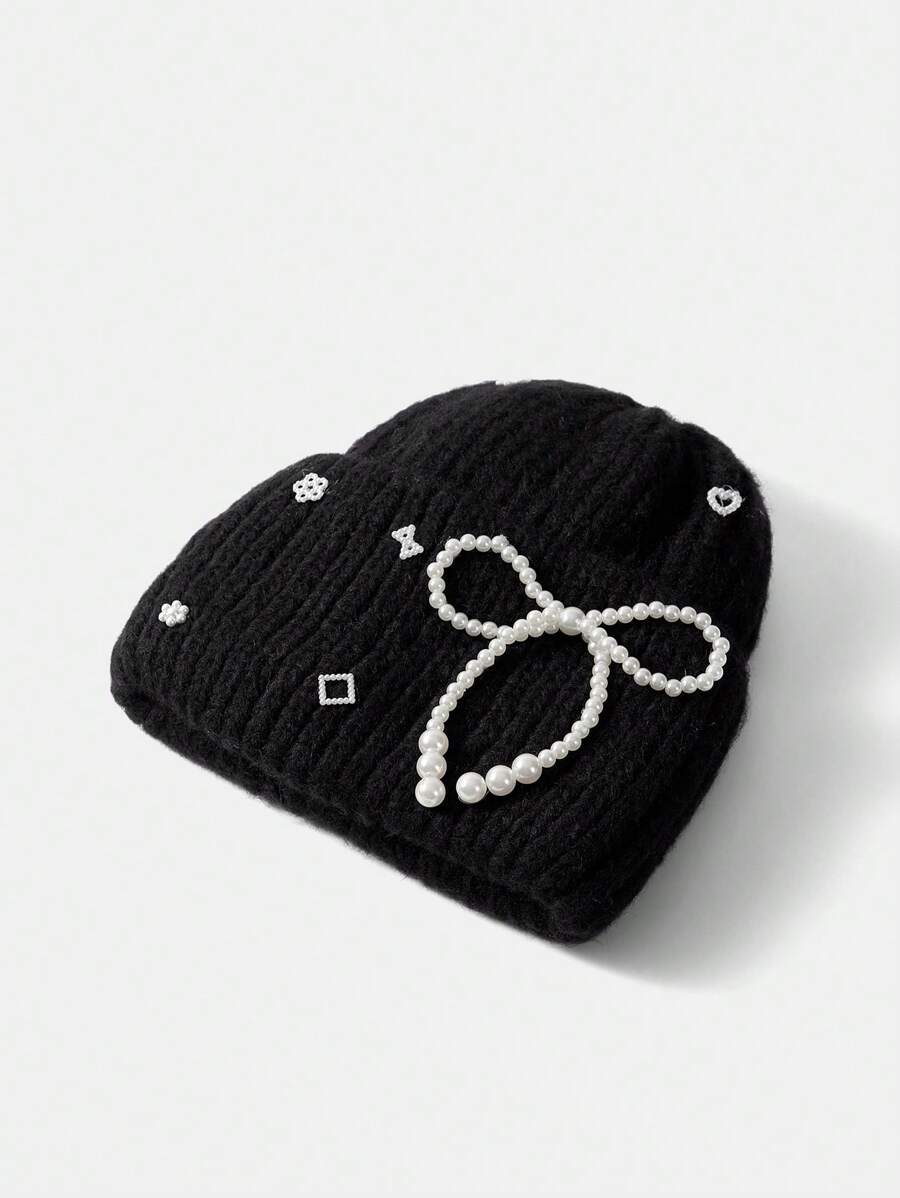 Kawaii Gorro de punto con lazo y perlas decorativas, estilo invernal para mujer