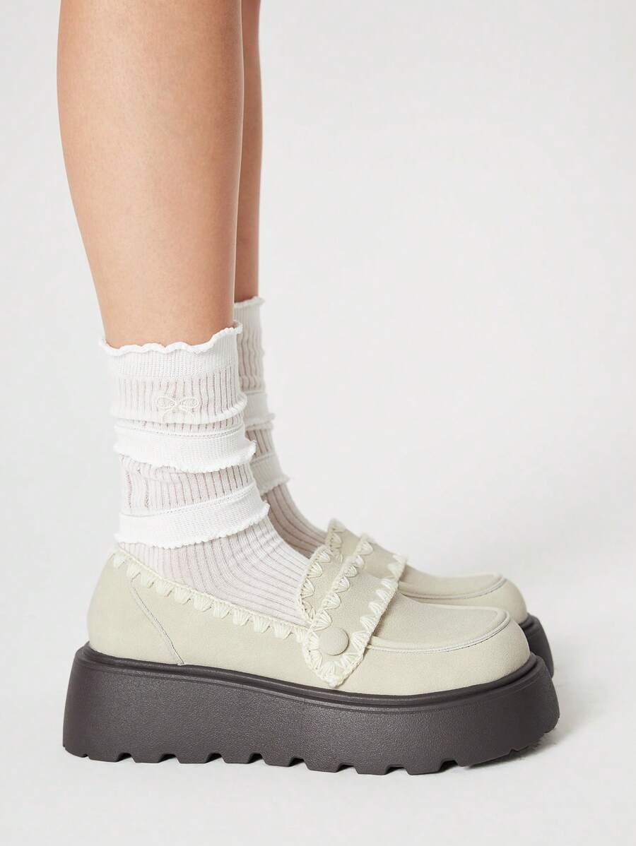 Kawaii Zapatos de mujer tipo mocasín con suela gruesa, estilo universitario a juego con falda, punta redonda, tacón alto de 6 cm, en color beige.