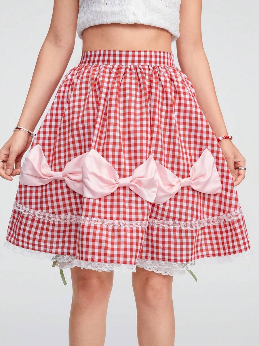 Kawaii Falda de encaje dulce con lazo para mujer en verano con diseño floral y rayas